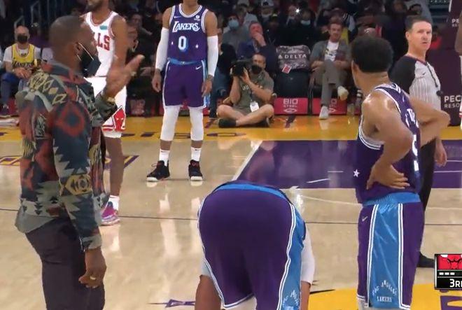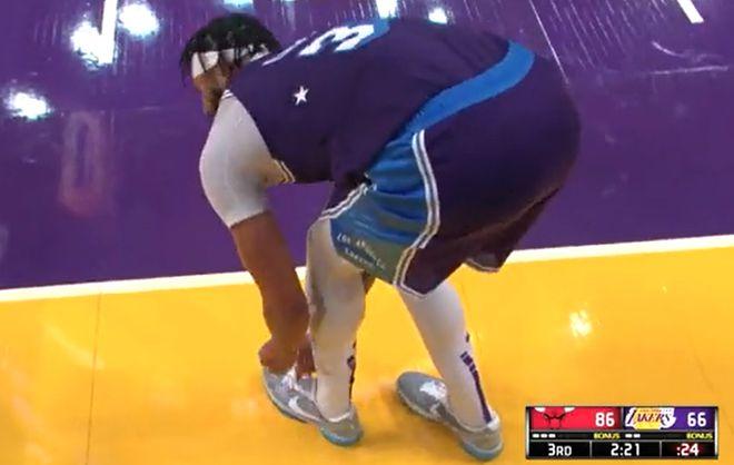 然而,浓眉被公牛球员踩掉鞋之后,裁判并没有给他系鞋带的时间。