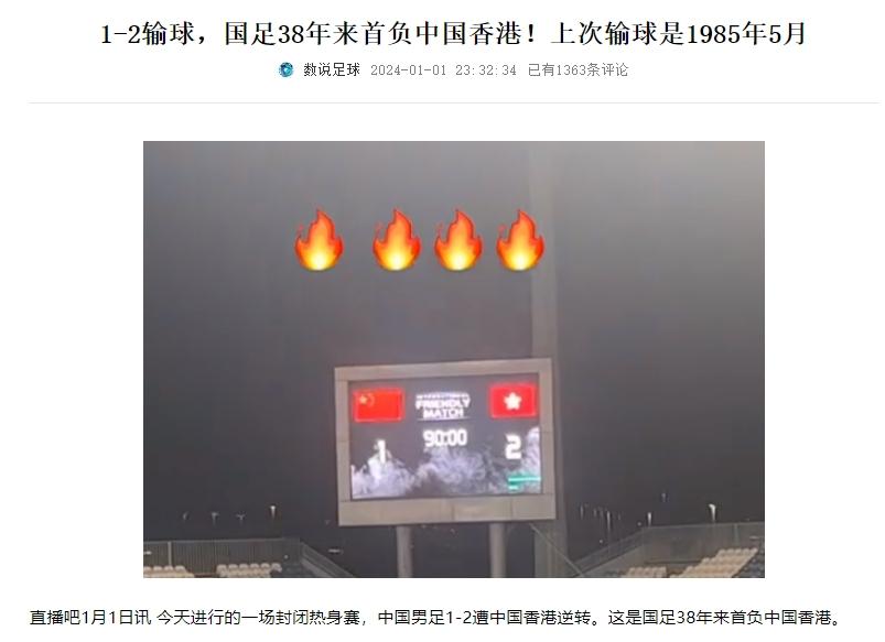 1月1日元旦当天的封闭热身赛,中国男足1-2遭中国香港逆转。这是国足38年来首负中国香港。