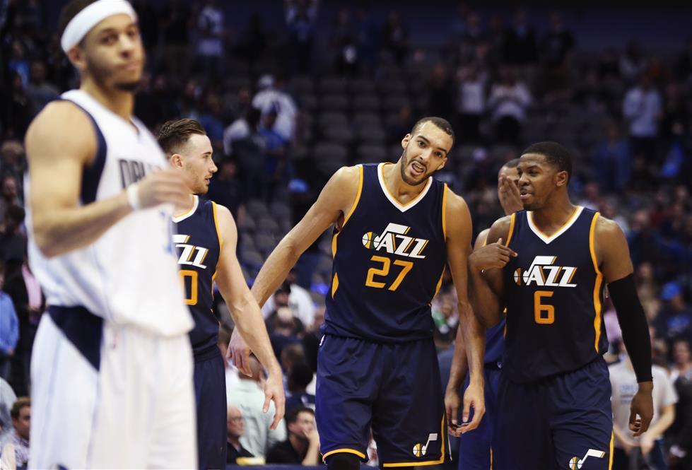 1月20日,爵士队球员约翰逊、戈波特与海沃德(右一至右三)在比赛中。当日,在2016-2017赛季NBA常规赛中,犹他爵士队客场以112比107战胜达拉斯小牛队。 新华社/路透
