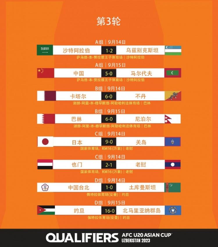 直播吧9月15日讯 U20亚预赛ABCD组结束第三轮争夺,中国本轮5-0击败马尔代夫,同组的沙特1-2不敌乌兹别克斯坦。