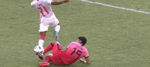 第31分钟,韩国反击,姜成进左侧带球推进到禁区,左脚一扣闪开防守,一脚抽射擦着左侧立柱出了底线。↓