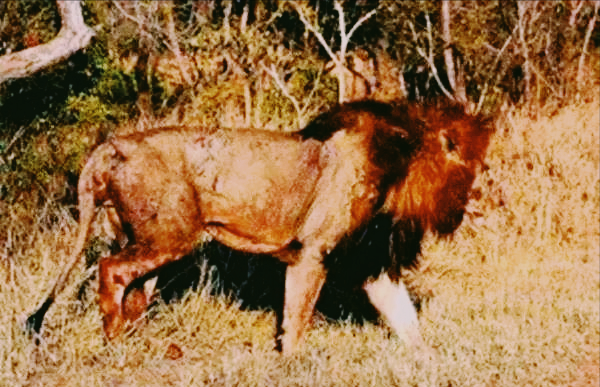第二天,疲惫的大菜花雄狮独自踏上了旅途,在别人眼里,它失去了一个负担,但在重情重义的大菜花雄狮眼里,它失去了一个兄弟。它有些悲伤,更显得颓废,似乎一下子失去了奋斗的力量,它走了没多久,就趴在大树下大口地喘息着。