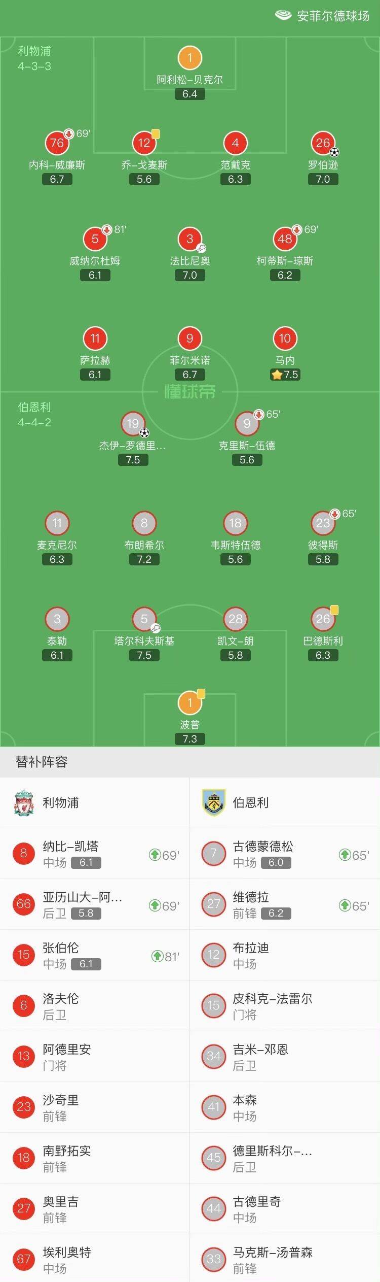 第69分钟,塔尔科夫斯基头球助攻,杰伊-罗德里格斯转身抽射破门。利物浦1-1伯恩利。