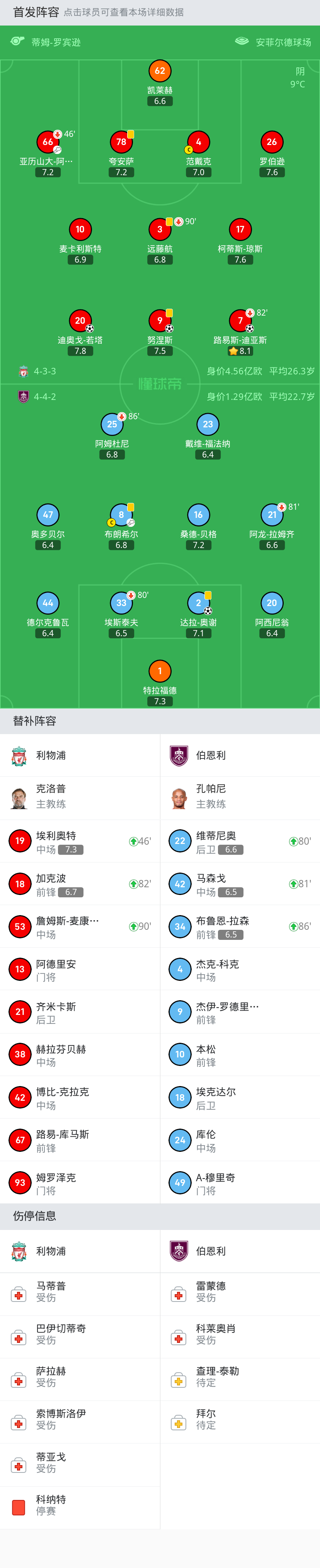 最终全场比赛结束,利物浦1-1伯恩利。