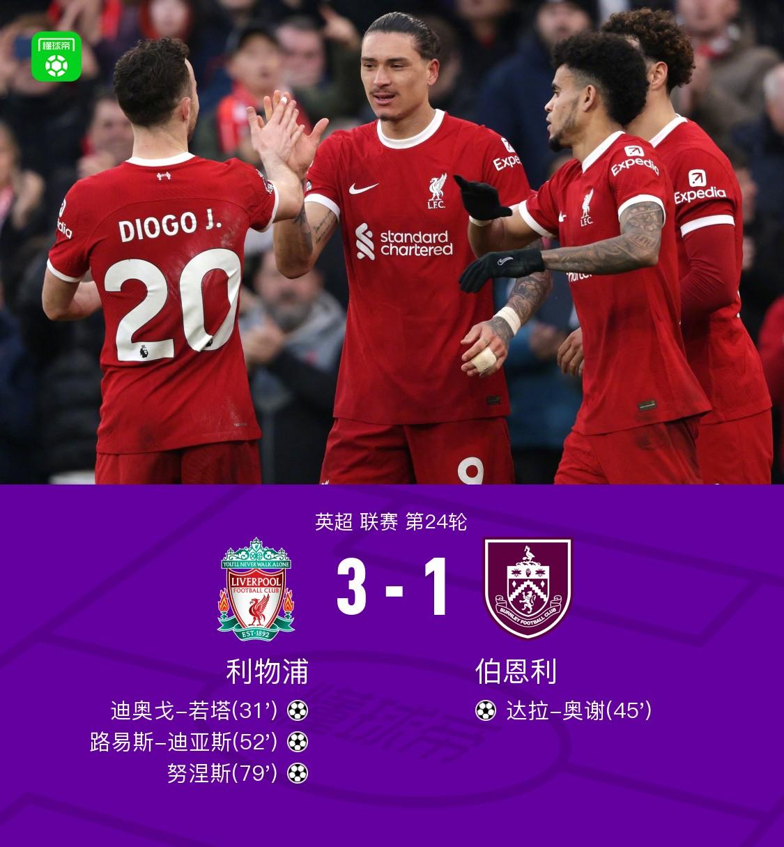 北京时间2月10日23:00,英超第24轮继续进行,利物浦坐镇主场安菲尔德球场迎战伯恩利,本场主裁判为蒂姆-罗宾逊。上半场,阿诺德角球助攻若塔头槌首开记录,达拉-奥谢同样通过角球头槌扳平比分。下半场,迪亚斯与努涅斯先后头球建功。最终,利物浦主场3-1击败伯恩利。