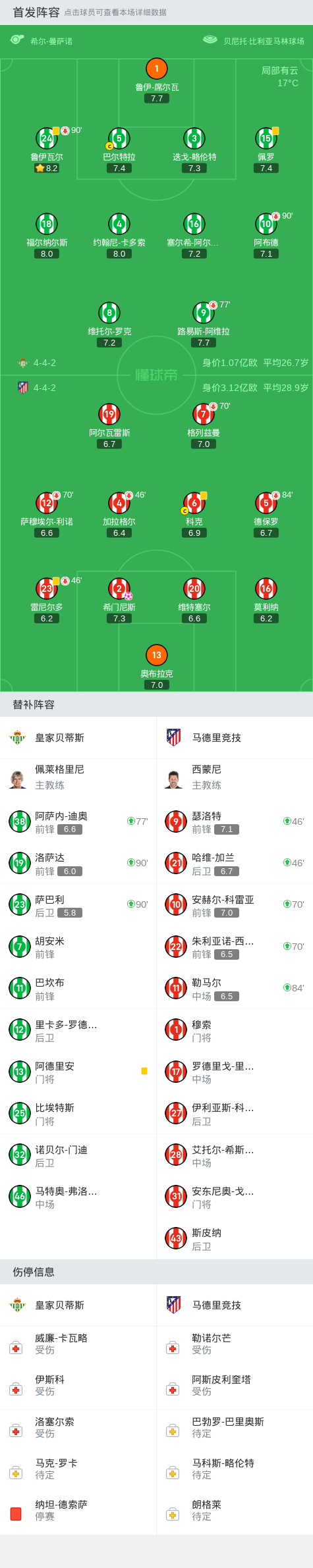 贝蒂斯出场阵容:1-鲁伊-席尔瓦、24-鲁伊巴尔(91’23-萨巴利)、5-巴尔特拉、3-迭戈-略伦特、15-佩罗、16-阿尔蒂米拉、4-卡尔多索、18-福尔纳斯、10-阿布德(91’19-洛萨达)、9-路易斯-阿维拉(77’38-迪奥)、8-罗克