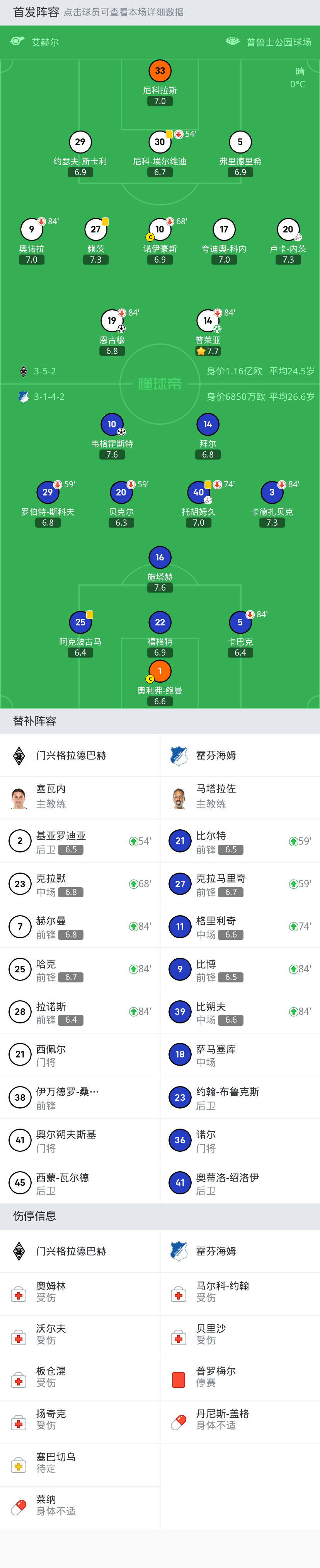 霍芬海姆 首发:1-奥利弗-鲍曼, 22-福格特, 3-卡德扎贝克, 25-阿克波古马, 10-韦格霍斯特, 29-罗伯特-斯科夫, 5-卡巴克, 16-施塔赫, 14-拜尔, 20-贝克尔, 40-托胡姆久