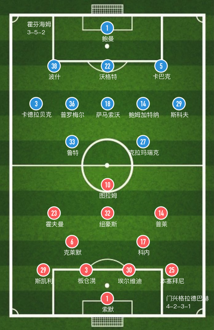 霍芬海姆(3-5-2): 1-鲍曼,38-波什,22-沃格特,5-卡巴克,3-卡德拉贝克(64' 25-阿克古玛),36-普罗梅尔,18-萨马索沃(24' 34-恩索基),14-鲍姆加特纳(81' 35-达马尔),29-斯科夫,33-鲁特(64' 7-拉森),27-克拉玛瑞克(81' 16-鲁迪)