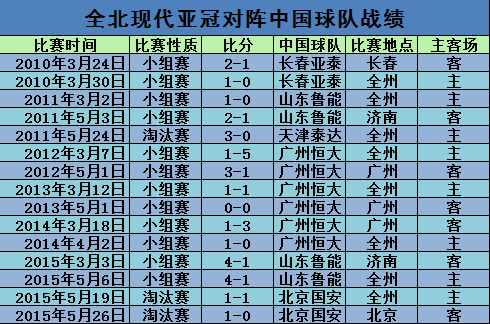附:全北现代亚冠对阵中国球队战绩