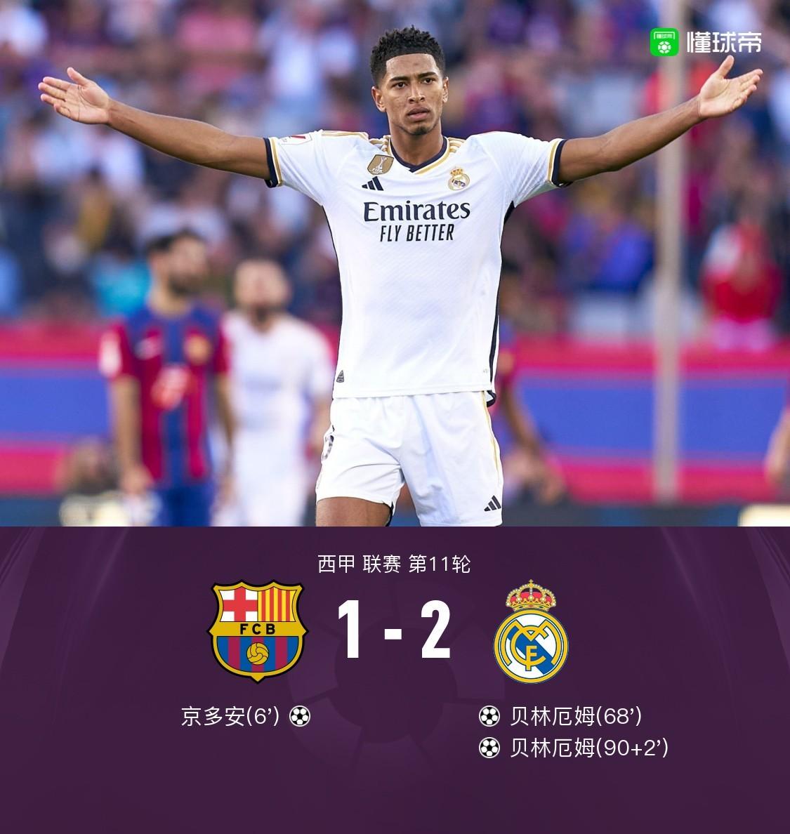 本场比赛,贝林厄姆双响+世界波,巴萨方面,京多安打进一球。