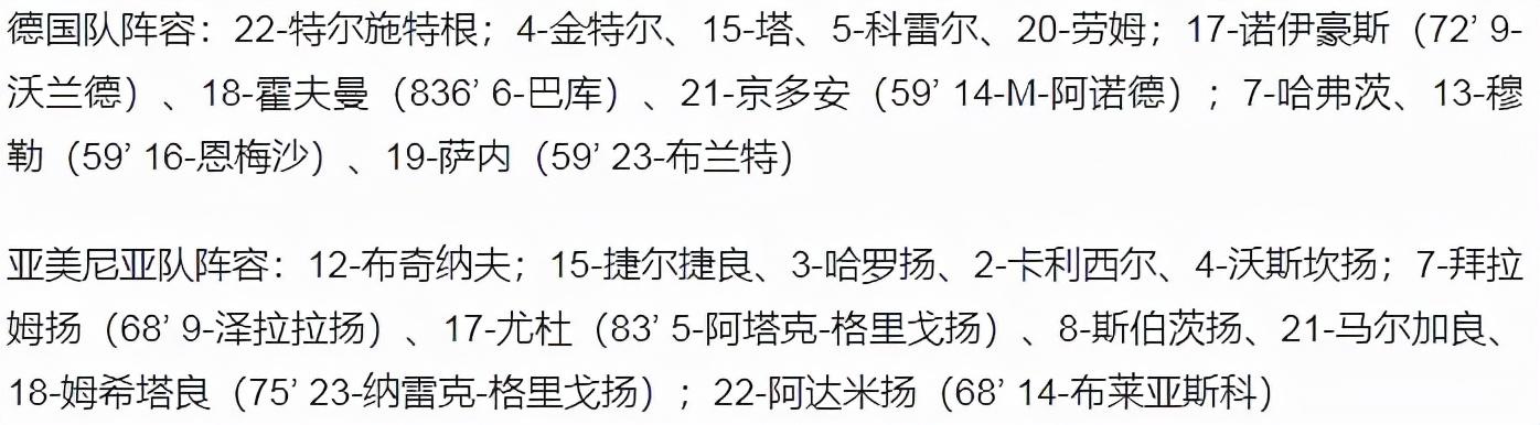 德国首发:1-诺伊尔、18-霍夫曼(46'16-恩梅加)、5-科雷尔(71'4-金特尔)、2-吕迪格、3-京特尔、8-格雷茨卡(46'17-诺伊豪斯)、21-京多安(63'14-阿诺德)、6-巴库、11-罗伊斯、19-萨内(63'9-弗兰德)、13-穆勒