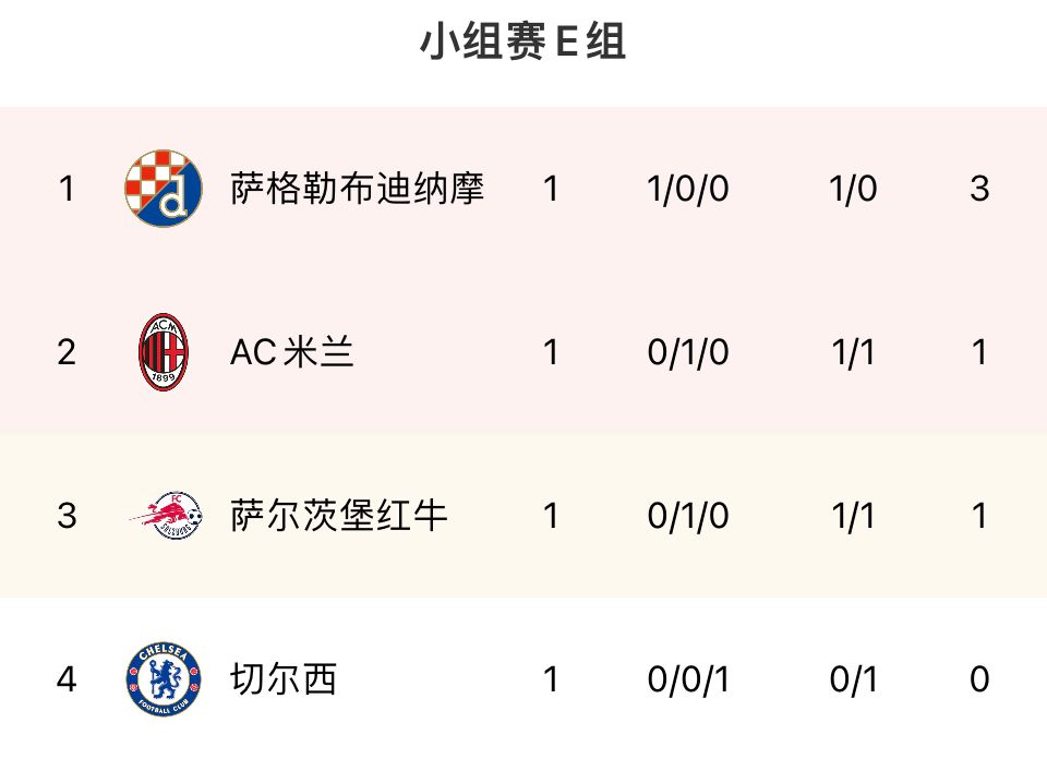 欧冠联赛第一轮的比赛结果是什么?小组赛第1轮09-0700:45萨格勒布迪纳摩1-0切尔西09-0700:45多特蒙德3-0哥本哈根09-0703:00AC米兰1-1萨尔茨堡红牛09-0703:00...