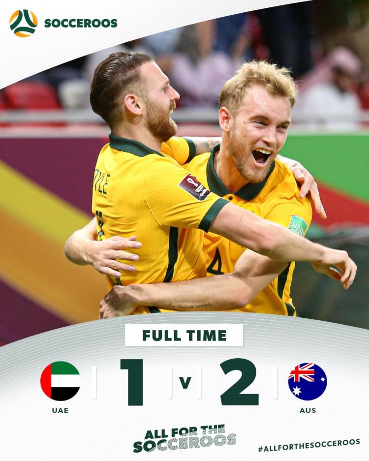 北京时间6月8日凌晨,世预赛亚洲区附加赛在卡塔尔多哈进行,由阿联酋迎战澳大利亚。上半场比赛,两队均无威胁进攻,第53分钟,杰克逊-欧文为澳大利亚打破僵局,4分钟后,阿联酋迅速扳平比分,第84分钟,赫鲁斯蒂奇为澳大利亚打入制胜球,最终澳大利亚2-1击败阿联酋,将与秘鲁争夺一张世界杯正赛名额的入场券。