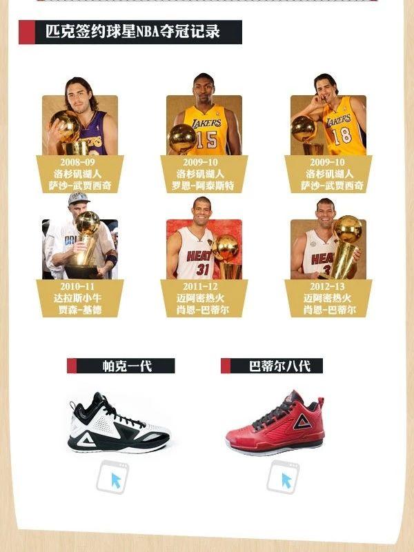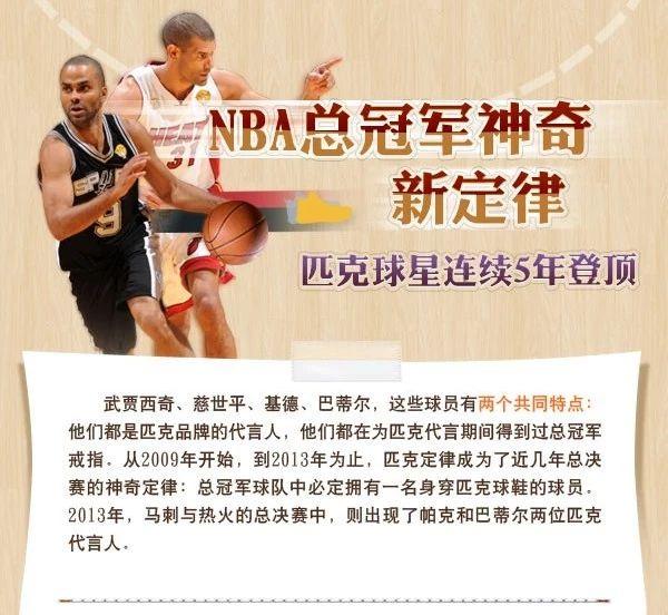匹克定律Tips:夺冠球队中穿匹克的人分别有:08-09赛季湖人队武贾西奇、09-10赛季武贾西奇;10-11赛季小牛队基德;11-12赛季热火巴蒂尔、12-13赛季巴蒂尔;13-14赛季帕克;14-15赛季勇士(断档);15-16赛季骑士德拉维多瓦(16年6月2日签约)。