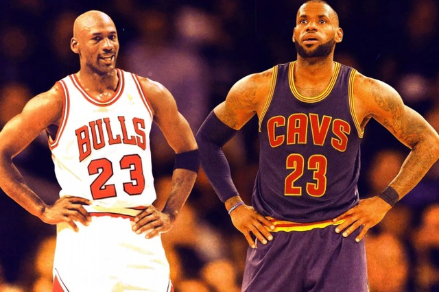 再来看看常规赛的对比数据:同样是15个赛季,乔丹的胜率是65.9%,詹姆斯是66.8%;乔丹场均得分30.1分,詹姆斯是27.1分;乔丹场均篮板6.2个,詹姆斯是7.3个;乔丹场均助攻是5.3次,詹姆斯是7.1次。两人同为场均0.8次封盖。乔丹场均抢断2.3次,詹姆斯场均1.6次;乔丹有31场50+的比赛,詹姆斯是11场。乔丹有28次三双,詹姆斯是56次。从这项对比来看,两人应该算是平手,乔丹偏重于进攻上的强大,詹姆斯是更全面的一个球员。