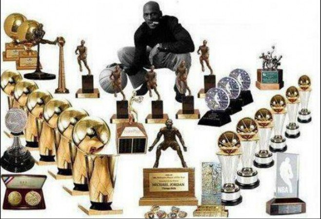 先来看看荣誉墙:同为1072场常规赛后,乔丹获得了5次常规赛MVP,詹姆斯是4次;乔丹6次总决赛MVP,詹姆斯是3次;乔丹11次入选最佳阵容,詹姆斯13次。乔丹1次年度最佳防守球员,詹姆斯没有;乔丹9次入选最佳防守阵容,詹姆斯6次。两人都得到了最佳新人奖。在这一块儿,胜出的无疑是乔丹。