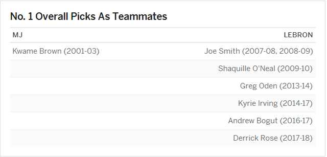 队友相关的一项数据,乔丹在生涯中只和一个状元秀当过队友,还是效力奇才期间的夸梅-布朗。詹姆斯呢?先后有6位,当然大部分不是巅峰时期,乔-史密斯、奥尼尔、奥登、欧文、博古特、罗斯。