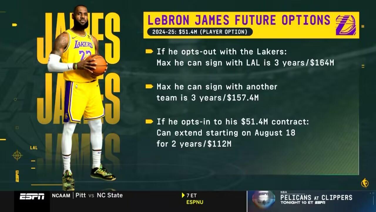 詹姆斯今夏拥有2024-25赛季5140万美元的球员选项,他有三种选择 :