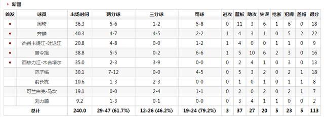 新疆队: 周琦18分11篮板3助攻、齐麟22分4篮板3助攻2盖帽、热甫卡提江9分4篮板、曾令旭16分5篮板10助攻、西热力江13分2篮板4助攻、范子铭18分5篮板3助攻、俞长栋8分、可兰白克7分2篮板、刘力鹏2分3篮板4助攻