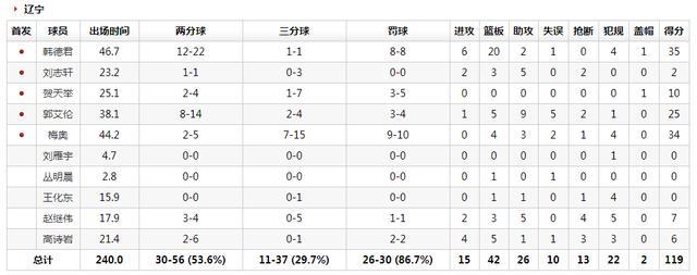 辽宁队: 韩德君35分20篮板2助攻、刘志轩2分3篮板5助攻、贺天举10分、郭艾伦25分5篮板9助攻、梅奥34分4篮板3助攻、赵继伟7分3篮板5助攻、高诗岩6分5篮板