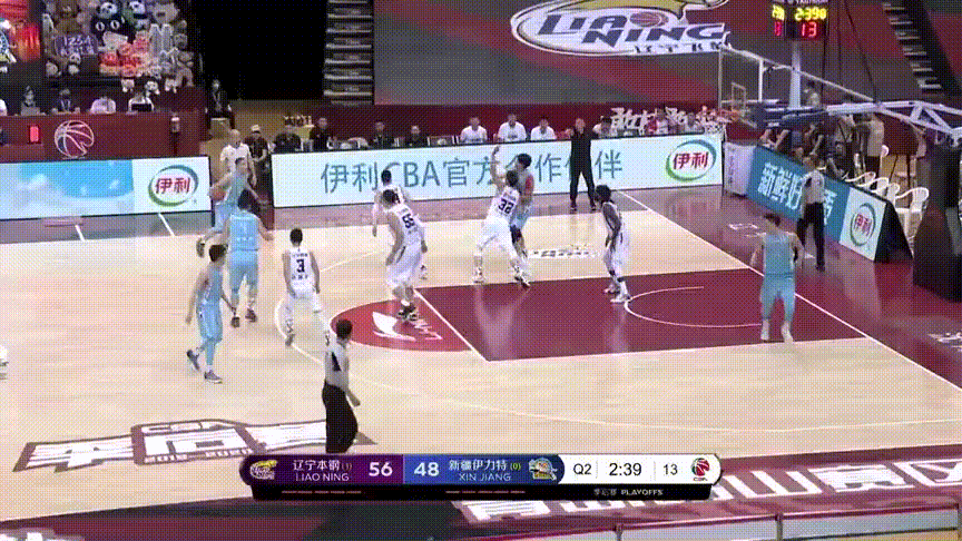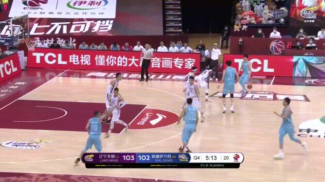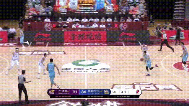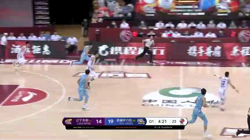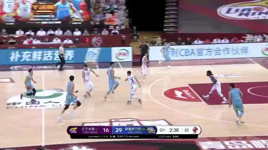沙拉木、琼斯、于德豪和威金顿,新疆的四位主要轮换球员三分命中率均在三成以下,只要他们持球或接球,辽宁坚决放他们投三分,而后形成五防四局面镇守油漆区和中距离,保护篮球;注意,当齐麟外线接球时,弗格、张镇麟和赵继伟们玩命扑防,甚至扣着防,尽量不让他有三分机会,达到的效果: