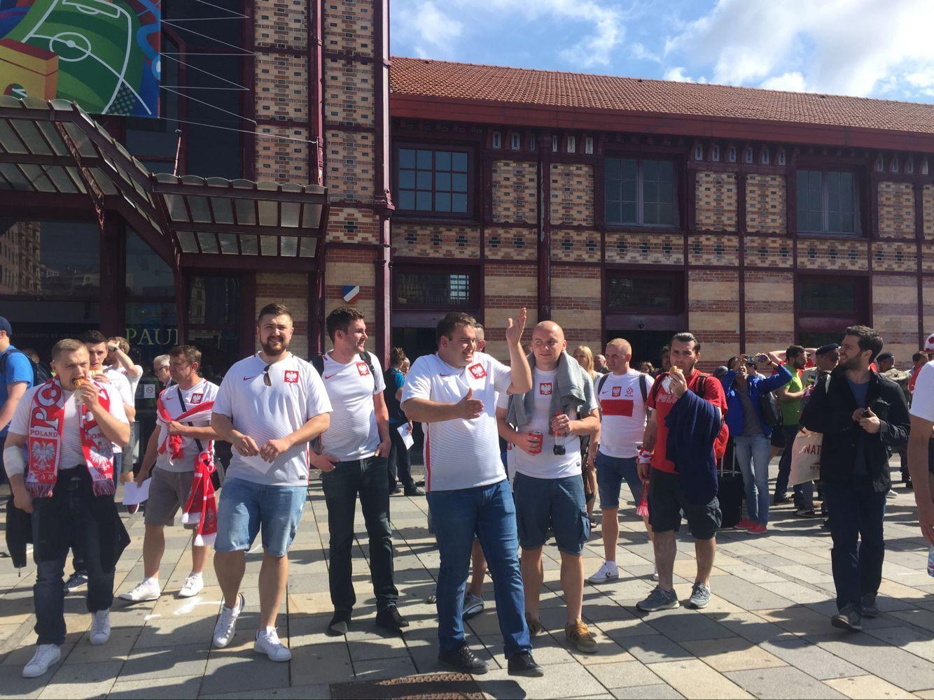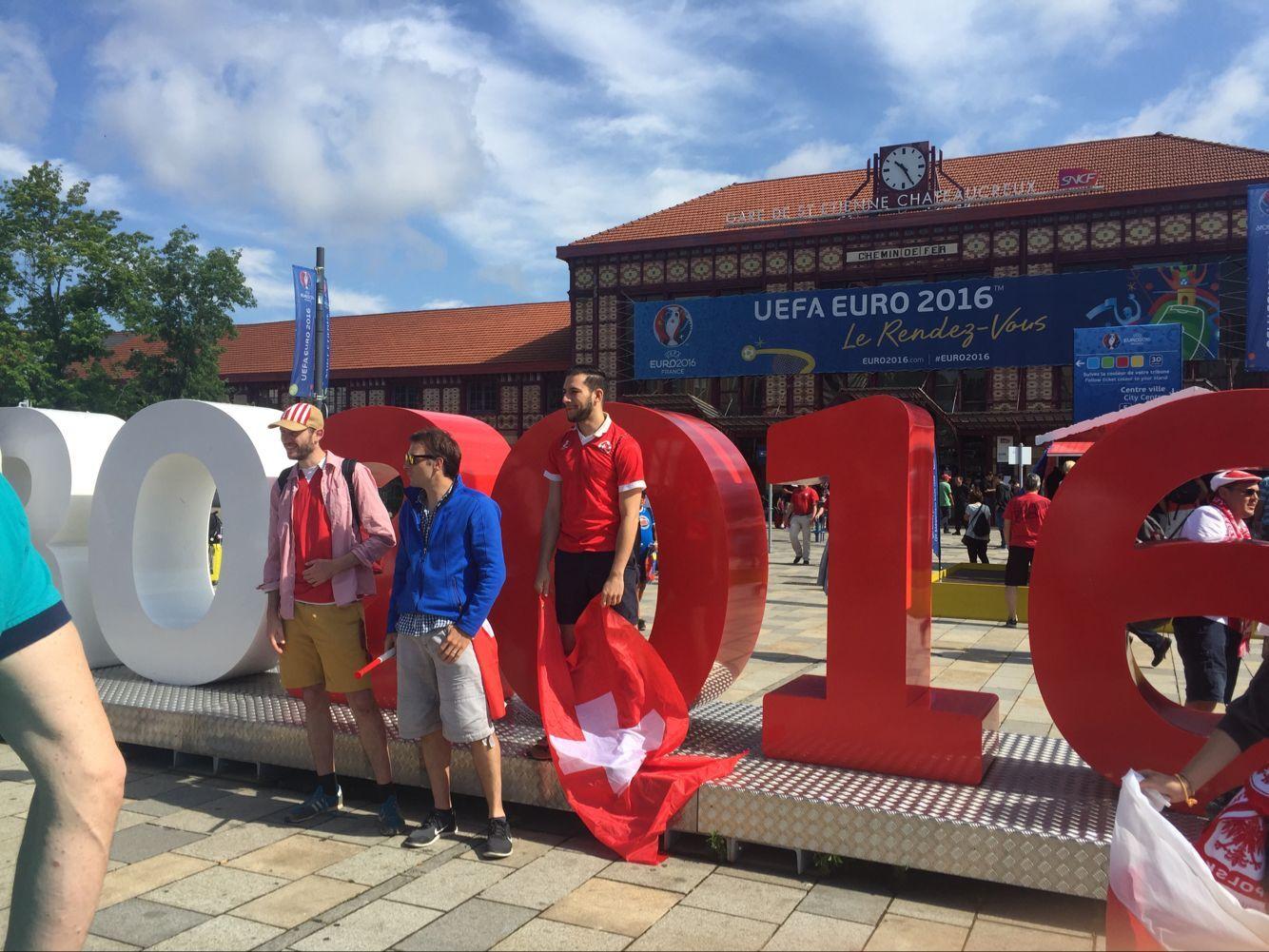 圣埃蒂安沙托克火车站距离热奥弗鲁瓦-基查尔球场差不多有2.5公里,很多瑞士和波兰的球迷基本上都是走路过去。比赛当地时间下午三点开始,但在12点之前,热奥弗鲁瓦-基查尔球场周围的大树底下、商店门口,就聚集了很多的球迷。12点过后,他们开始陆续进场。