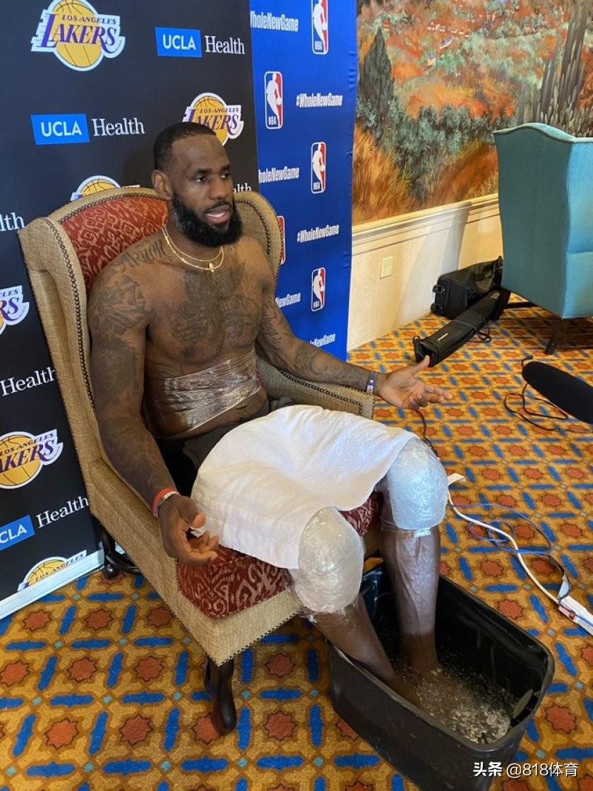 湖人各队记者Kyle Goon晒出勒布朗-詹姆斯训练后接受线上采访的照片,詹姆斯双膝包裹着厚厚的冰袋,双脚放在冰桶里接受治疗。