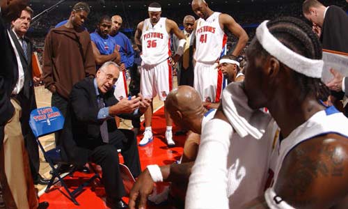 其二,活塞名帅拉里-布朗敏锐地发现了克制湖人的办法,改“砍鲨”为“放鲨”,坚持采用一人(大本或坎贝尔)对位奥尼尔,集结重兵死掐湖人外线,隔断奥尼尔和队友的联系,收效甚巨;而在进攻端,活塞则将布朗的“合理篮球”贯彻到底,一招一式都经过无数演练烂熟于胸;