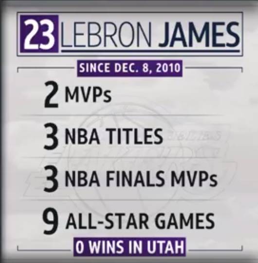 在本场比赛前,詹姆斯自美国时间2010年12月8日后,客场征战爵士高原魔鬼主场未曾赢过球。在今天詹姆斯终于赢下了自2010年12月8日后客场对阵爵士的首胜。