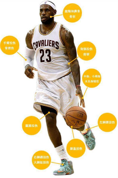 2007年是詹姆斯生涯的第一个巅峰。那一年他率领孱弱的骑士一路杀进总决赛。他在常规赛出战了78场,场均砍下27.3分6.7篮板6.0助攻。可是你知道他身上带着多少伤病吗——大拇指扭伤、膝盖肌腱炎、背部痉挛、脚踝扭伤,还是两次。