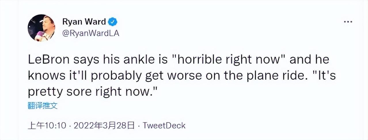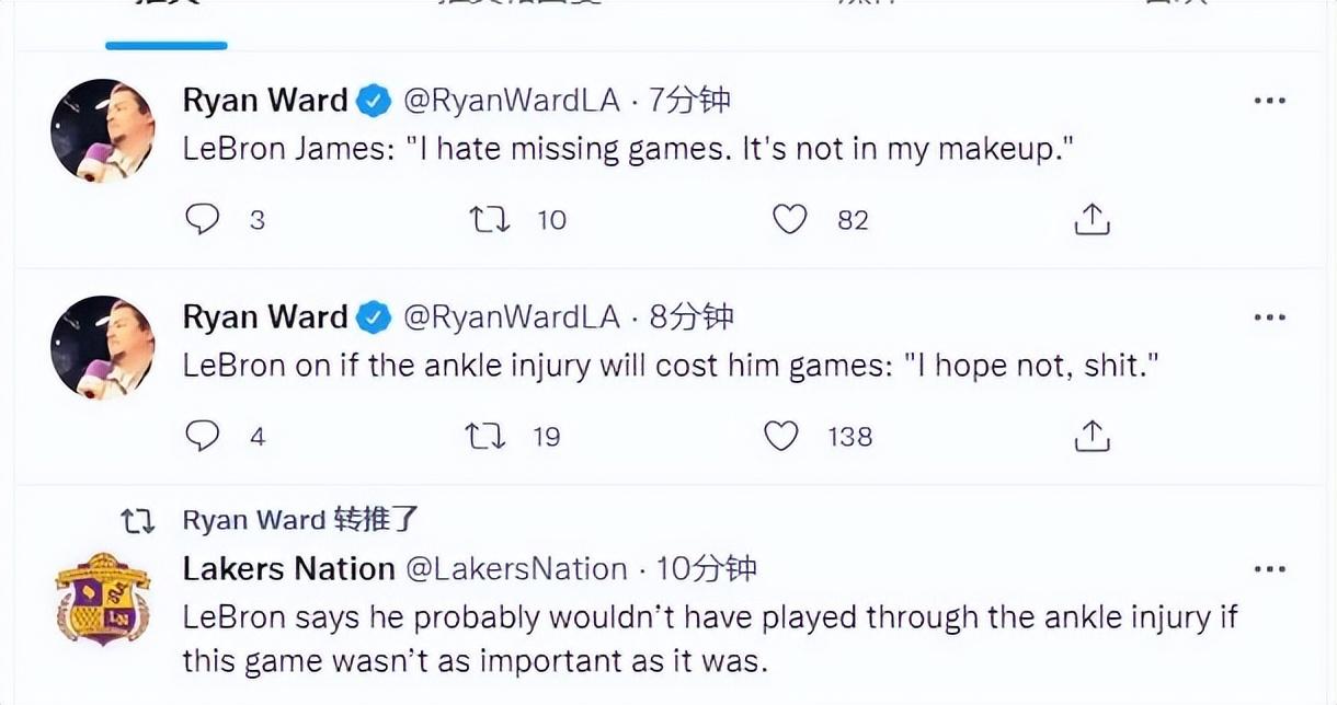 当被询问是否会导致他缺席比赛,詹姆斯说:“我希望不会,狗屎。我讨厌缺席比赛,(缺席比赛)不是我的风格。”詹皇的脚踝伤势成为了湖人接下来比赛的不确定因素,紫金军团要想守住附加赛席位困难重重。