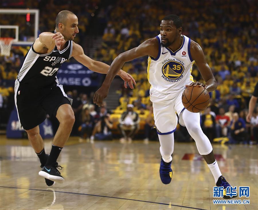 ↑4月14日,勇士队球员杜兰特(右)在比赛中带球突破马刺队球员吉诺比利的防守。新华社/美联