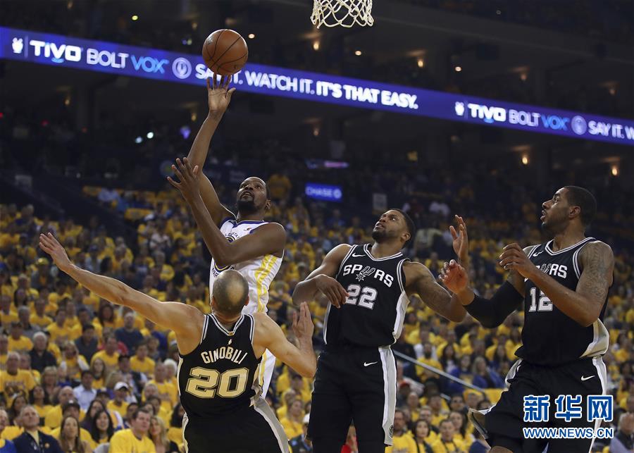 ↑4月14日,勇士队球员杜兰特(上左)在比赛中投篮。当日,在2017-2018赛季NBA季后赛首轮比赛中,金州勇士队主场以113比92战胜圣安东尼奥马刺队,以总比分1比0暂时领先。新华社/美联