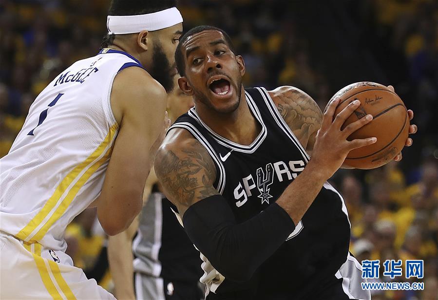↑4月14日,勇士队球员麦基(左)在比赛中防守马刺队球员阿尔德里奇。新华社/美联
