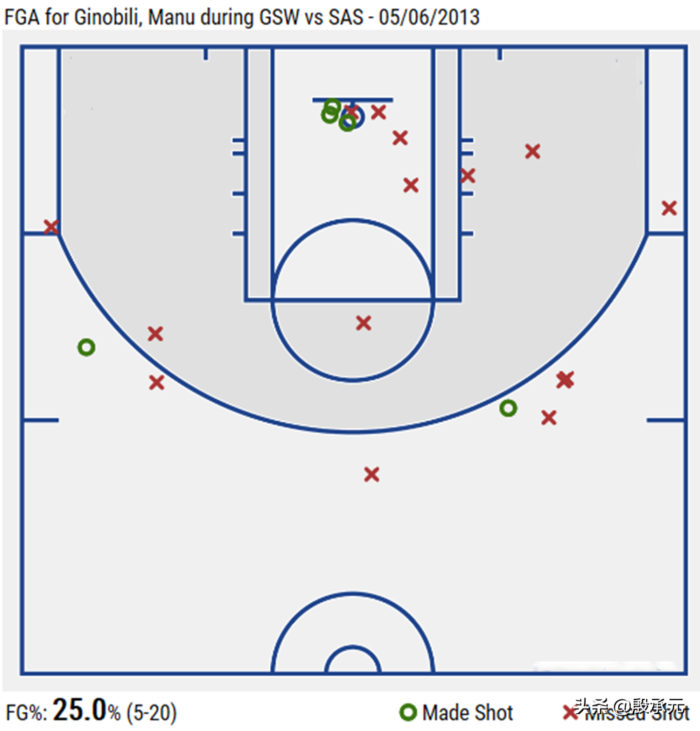 在马刺有4名球员得分不低于18分、勇士的库里以51.4%的投篮命中率和42.9%的三分球命中率得到了44分的情况下,吉诺比利这样的整体进攻效率确实非常糟糕。从上面这张投篮图可以看出,吉诺比利在那场比赛里除了篮下之外的投篮几乎都没有收获,中距离投篮和两个底角的三分球投篮全部以打铁告终,在命中那记绝杀的三分球之前他在那场比赛里在三分线外一共8次出手仅仅命中1球!但是,就是在这样一个手感冰凉的夜晚吉诺比利却命中了绝杀球,成为了球队获胜的英雄。