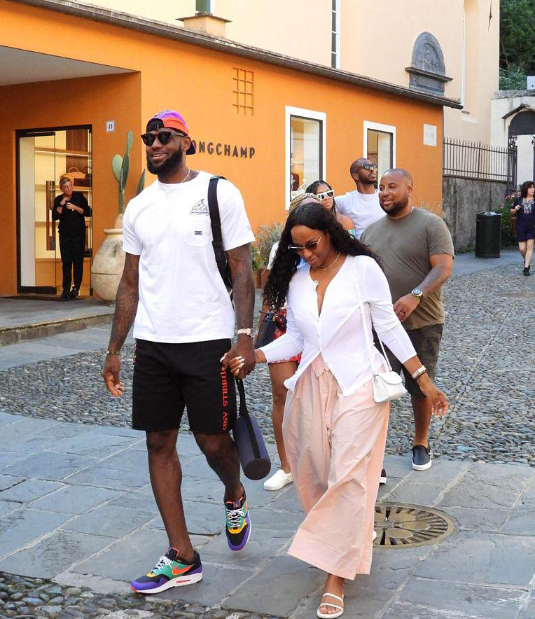 詹姆斯与妻子萨瓦娜一同漫步于小城街头,前往奢侈品商店购物,夫妻二人显得十分恩爱。