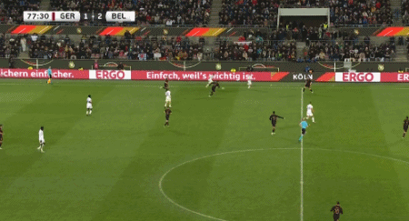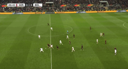 第87分钟,德国队打出反击,沙德在中场带球推进,来到禁区左侧底线前横传中路,跟上的格纳布里在小禁区线上推射破门,德国队2-3落后比利时队。