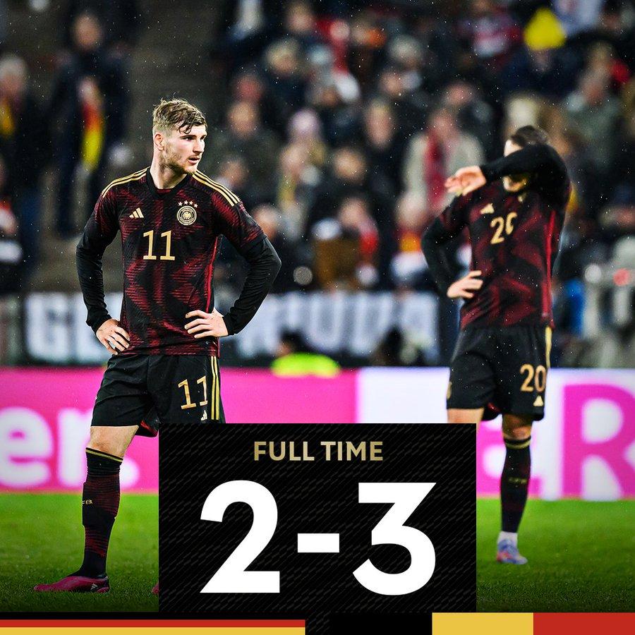 北京时间3月29日凌晨2点45分,德国队和比利时队进行一场热身赛。上半场,德布劳内先后助攻卡拉斯科和卢卡库破门,卢卡库进球后又头球击中横梁并手球送给对手点球,菲尔克鲁格打进点球;下半场,维尔纳破门因越位而无效,德布劳内打入一球,格纳布里连过四人射门中柱,随后他再扳一球。最终,德国队2-3不敌比利时队。