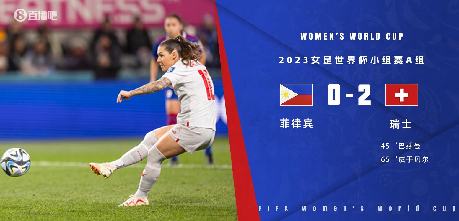 直播吧7月21日讯 北京时间7月21日13:00,女足世界杯小组赛A组第一轮菲律宾迎战瑞士的比赛,上半场吉尤破门被吹,索乌造点巴赫曼主罚破门,半场结束,瑞士女足1-0菲律宾女足。下半场皮于贝尔补射破门,最终瑞士女足2-0菲律宾女足取得开门红。