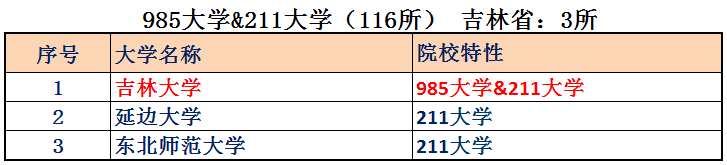 吉林省共有3所985大学或者211大学,吉林大学,延边大学,东北师范大学,数量位列全国并列第11,占全国总数的2.5%。