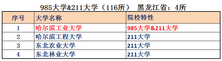 黑龙江省共有4所985大学或者211大学,哈尔滨工业大学,哈尔滨工程大学,东北农业大学,东北农林大学,数量位列全国并列第7,占全国总数的3.4%。