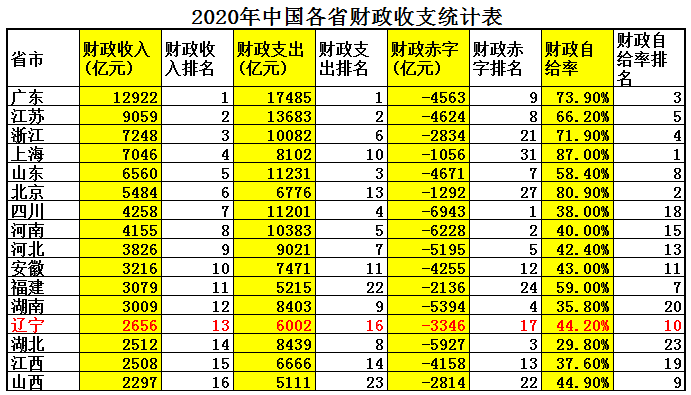 2020年辽宁省财政收入2656亿元,位列中国第13;财政支出6002亿元,位列中国第16;财政赤字-3346亿元,位列中国第17;财政自给率44.2%;位列中国第10。