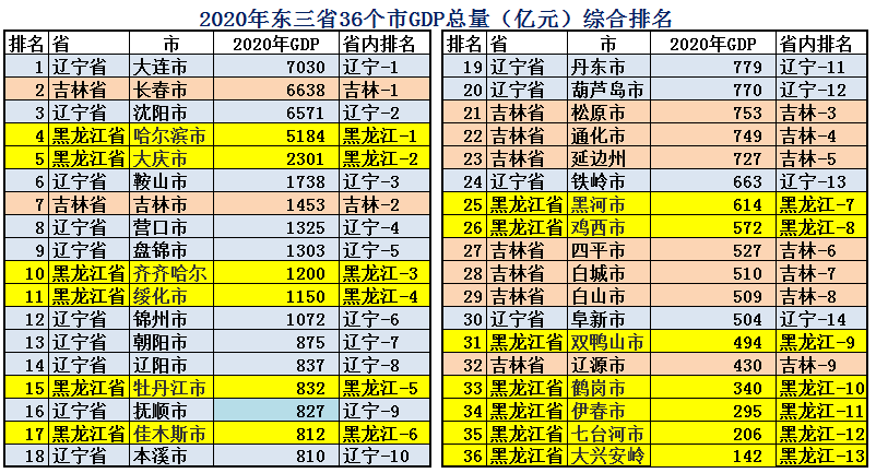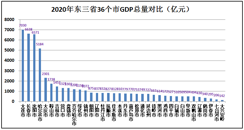 东三省36市中2020年GDP排名第一是辽宁省大连市7030亿元;排名第二的是吉林省长春市6638亿元;排名第三的是辽宁省沈阳市6571亿元;排名第四的是黑龙江省哈尔滨市5184亿元。