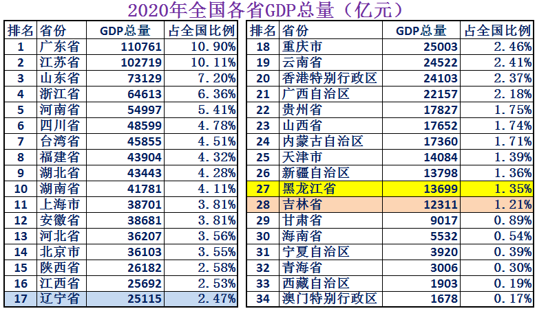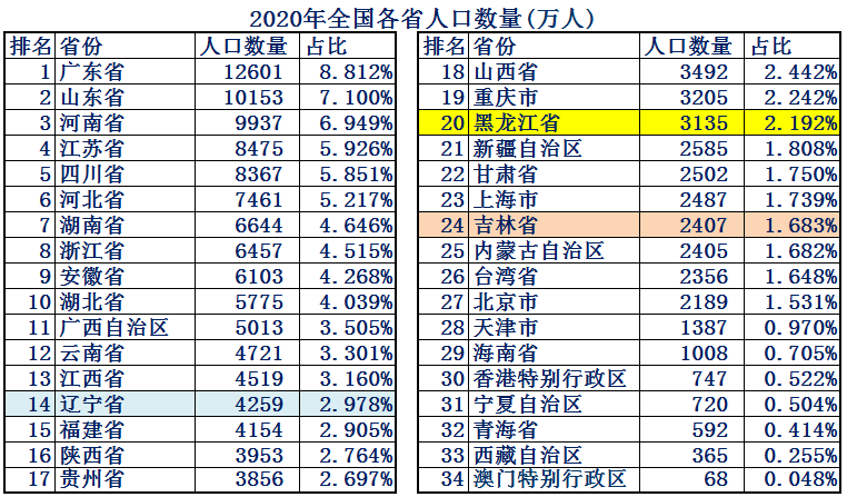 2020年辽宁省人口数量4259万人,在全国34个省直辖市自治区特别行政区中排名第14,占全国的2.978%,黑龙江省以占全国2.978%的人口数量创造了2.47%的GDP。