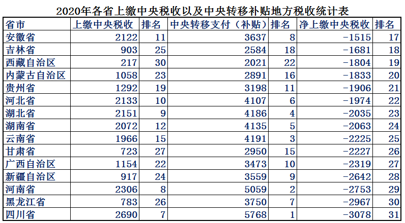 2020年中国31个省自治区直辖市(不含港澳台地区)中,只有八个省市是净上缴税收,即上缴给中央的税收多于中央补贴的税收。其它23个省市自治区都是国家补贴地方的税收多于上缴中央的税收。