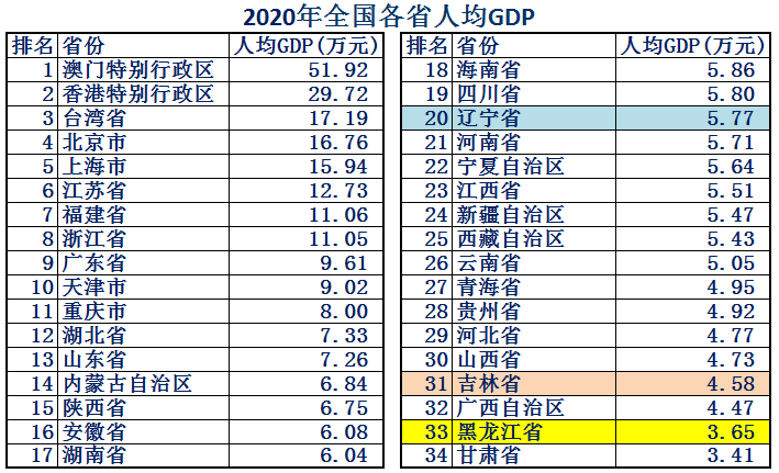 2020年黑龙江省人均GDP 3.65万元,在全国34个省直辖市自治区特别行政区中排名第33,比2020年全国人均GDP 7.23万元低3.58万元,在全国属于低收入地区。