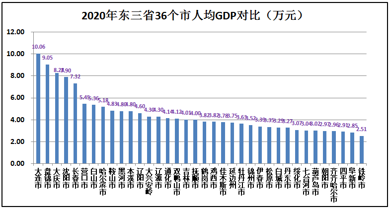 东三省36个市中只有大连市,盘锦市,大庆市,沈阳市,四个城市达到全国人均GDP 7.23万元的水平,其它各市都低于全国平均水平。
