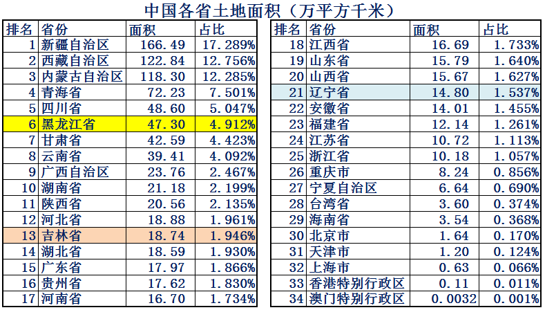 2020年黑龙江省土地面积47.30万平方千米,在全国34个省直辖市自治区特别行政区中排名第6,占全国的4.912%,黑龙江省以占全国4.912%的土地面积创造了1.35%的GDP。