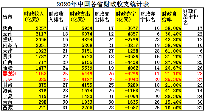 2020年吉林省财政收入1085亿元,位列中国第26;财政支出4127亿元,位列中国第26;财政赤字-3042亿元,位列中国第20;财政自给率26.3%;位列中国第27。