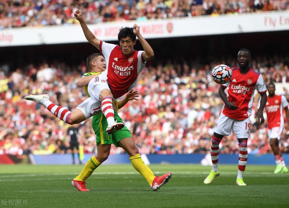 第44分钟,蒂尔尼左路突破传中,威廉姆斯头球解围不远,富安健洋禁区右路凌空垫射高出横梁。